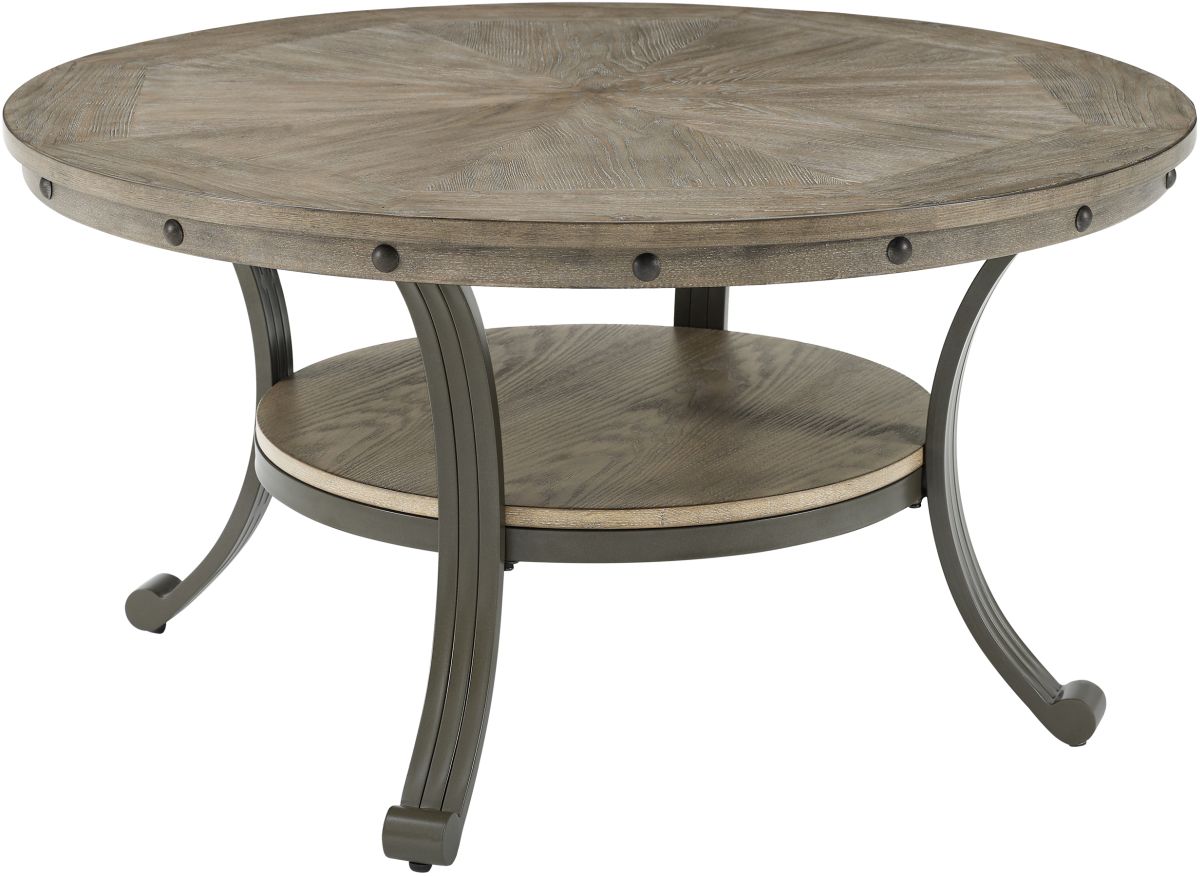 Mixing metal and wood in an updated industrial style provides a unique addition to your home. The round coffee table features an inlay patterned top in ash veneer in a grey finish. Sturdy enough to take on the busiest of family rooms and sophisticated enough to anchor a formal sitting area.Read More