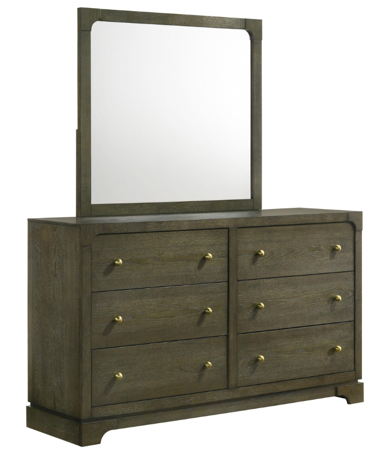 Elevate your bedroom with the sophisticated charm of this dresser and mirror set, designed with a transitional flair that features rounded corners and trending details. The dresser, finished in dark cocoa with brass knobs, offers a spacious storage solution with a touch of elegance.Read More