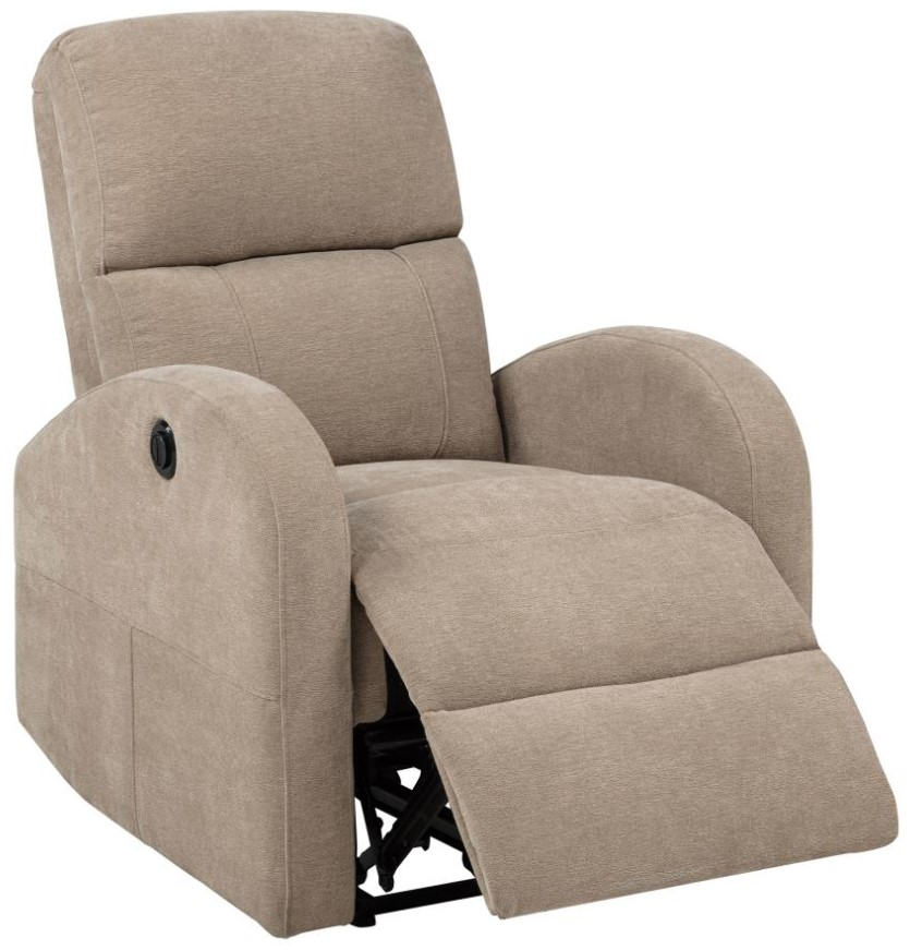 Power recliner in charcoal camel fabric blends classic shape with compact modern proportions