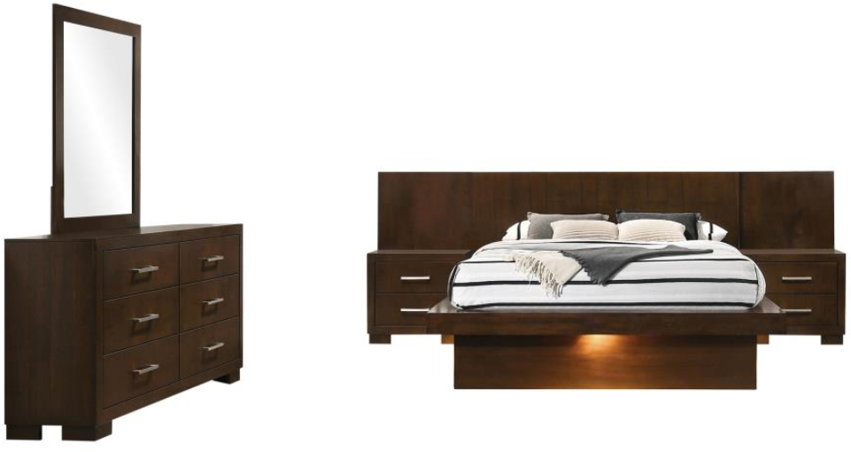 The set comes in a cappuccino finish with an Eastern King bed and matching pieces. Built-in panels connect the nightstand to the bed, offering convenient access and a coordinated look. Clean lines and smooth surfaces create a cohesive, practical bedroom arrangement.Read More