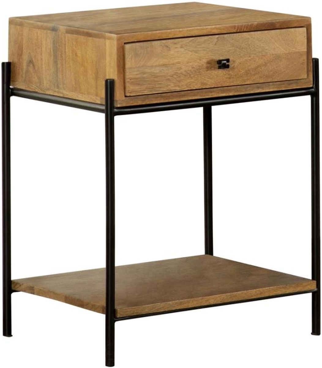 Situated on an iron base with sleek, thin rod supports, this rustic accent table offers up a modern industrial flair. Designed with solid mango wood that lends a natural finish to the tabletop and open bottom shelf, this accent table creates a charming warm hue to a space.Read More