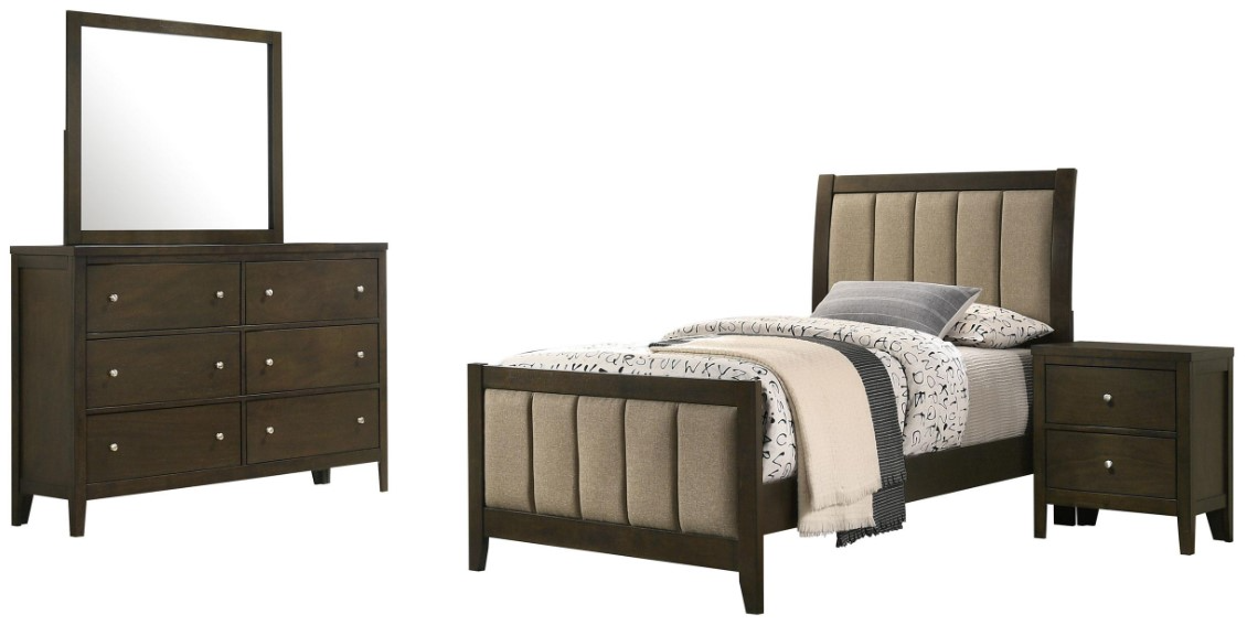 Includes: One (1) Twin bed, one (1) nightstand, one (1) dresser, one (1) dresser mirror