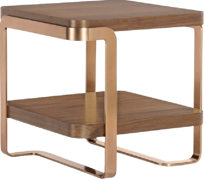 The Eleana end table is a stylish blend of warm light caramel walnut veneers and a sleek plated metal base with its softly rounded rectangular design and one fixed wood shelf, it offers both functionality and an elevated aesthetic, making it a perfect accent piece for transitional interiors.Read More