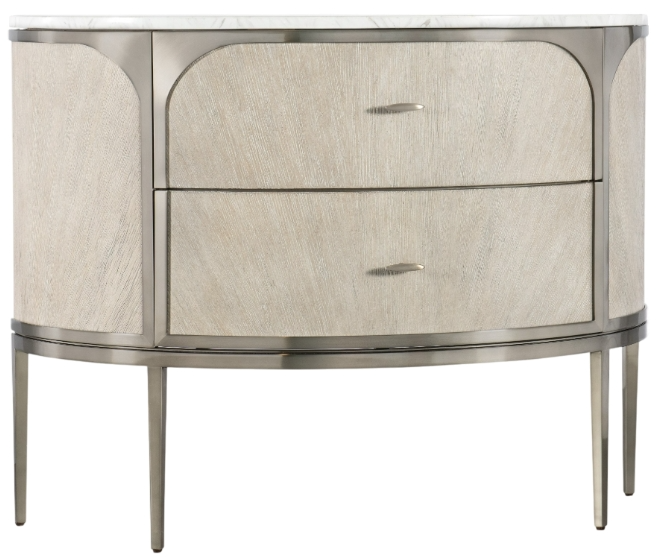 Architectural and timeless with a luxe mixture of materials, the Modern Mood nightstand is a statement piece. Featuring a demilune shape and two self-closing drawers, the nightstand has a metal frame, legs and slender pulls and a white and gray marble top.Read More