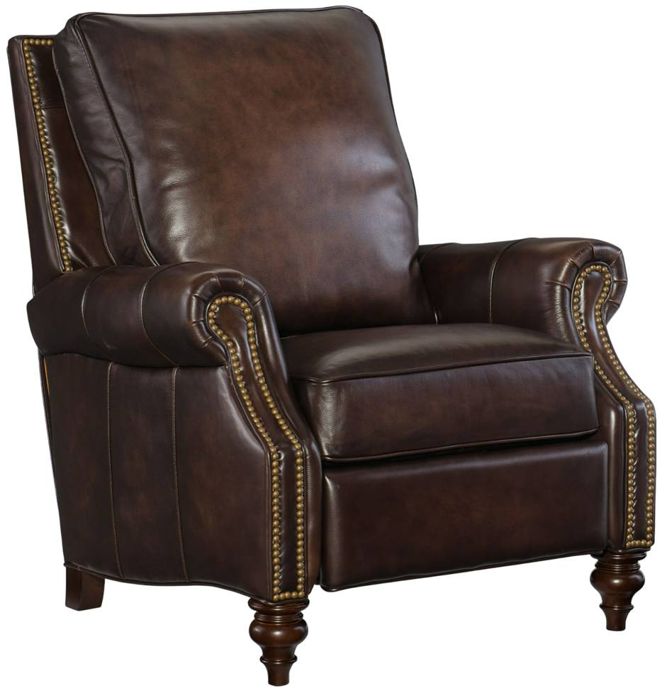Relax in classic style in the designer-friendly Conlon recliner, a refined club chair silhouette covered in plush semi-aniline top grain leather in a rich brown color. Nailhead trim and shaped spool feet add a decorative touch. Simply push on the arms to recline in effortless relaxation.Read More
