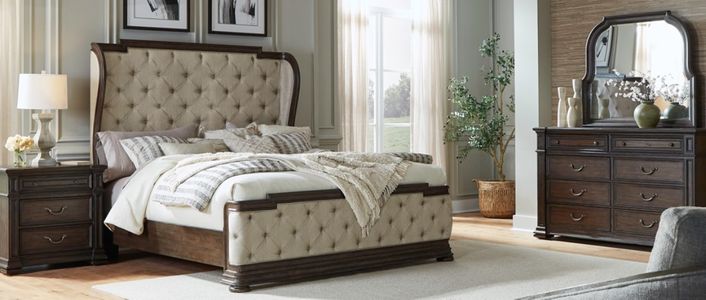 Turn your sleeping space into a luxurious haven with the Provence Park queen upholstered shelter bed, dresser, mirror, chest, and nightstand. Crafted with meticulous attention to detail using Rubberwood solids and Split Heart Hickory veneers, this set features a Chateau Brown finish.Read More