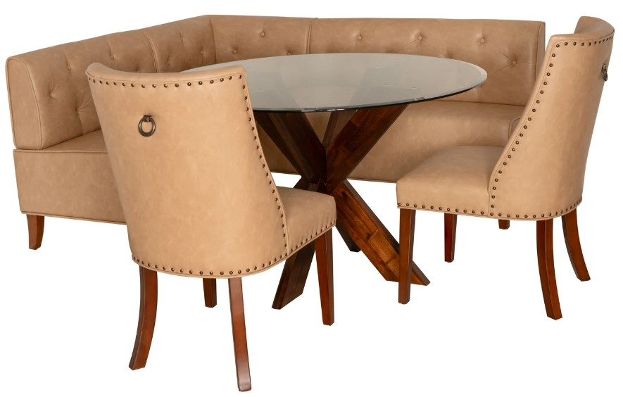 Complete 5-Piece Dining Set: Includes a 3-piece upholstered corner bench, two faux leather dining chairs, and a 48” round glass top dining table.