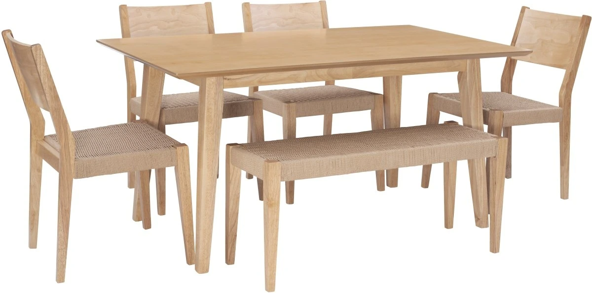 Chairs and dining bench have comfortable seats made of handwoven rope