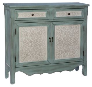 The antique blue slimline console adds sophistication and class to any room. The decorative curved bottom adds an extra touch of drama to the piece, and white panels with a raised decorative pattern adorn the front. The console opens with two doors to reveal storage space with a fixed shelf.Read More