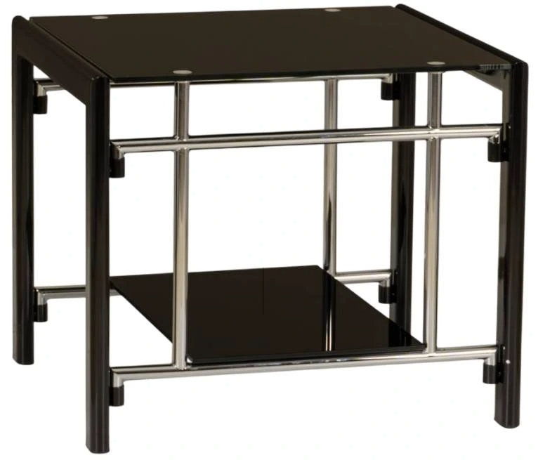 Black glass end table features contemporary "gloss black" frame with inset "gloss silver" grid side panels. Both the glass top and shelf have tempered glass. Folding assembly for the frame and sides, then drop the glass into place.Read More