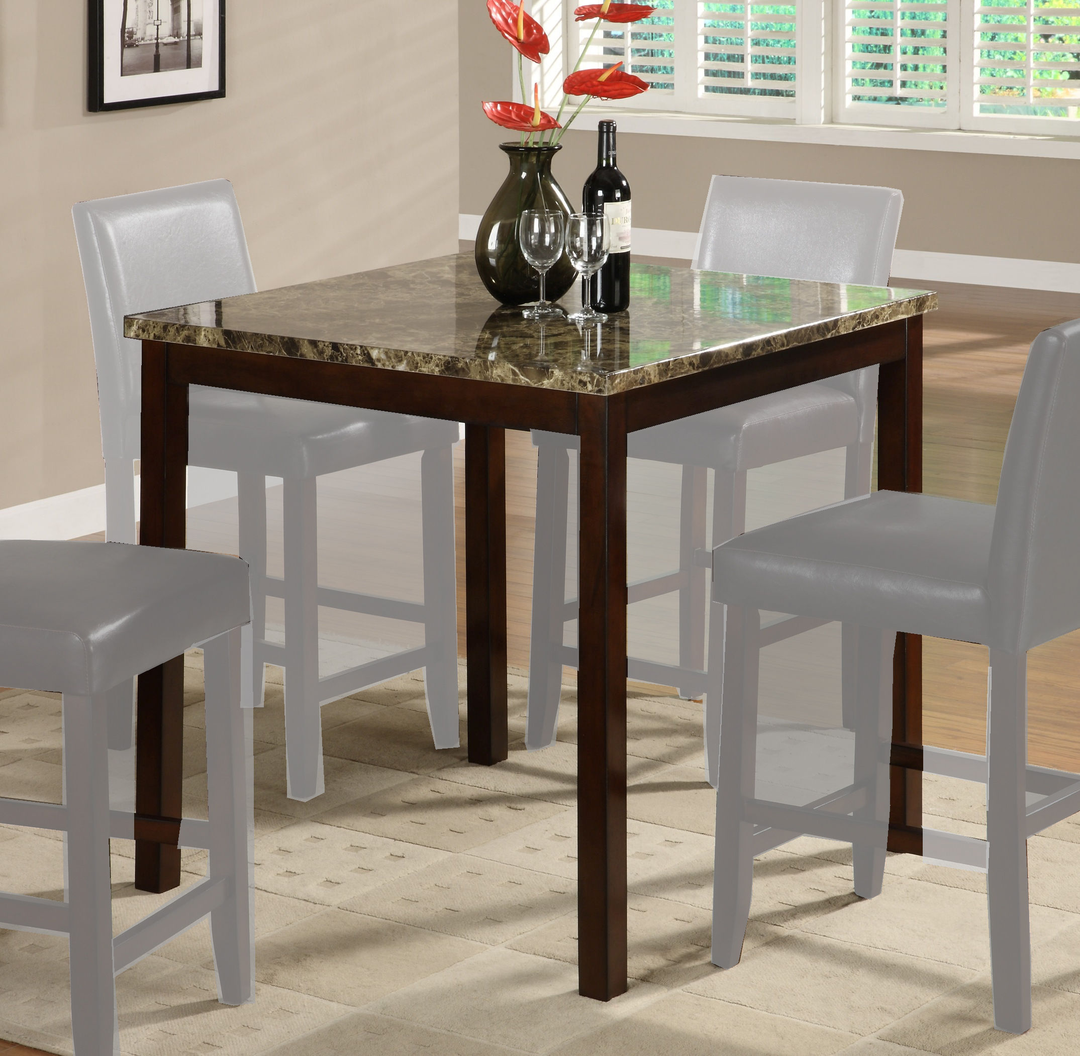 Add counter height dining table to your home. It features a sleek marble-like square table top plate that creates style and depth. The tapered legs are dark cherry.