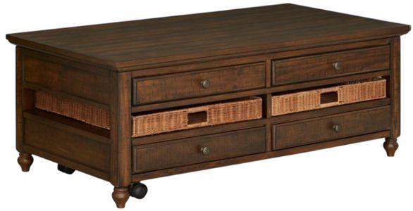 Put your feet up and relax with bungalow style with the Cottage Lane table ensemble. The appealing mix of materials includes pine veneer and solids, rattan baskets, casters, and weathered bronze hardware. Plenty of storage and easy lifestyle appeal welcome in this 4-piece causal collection.Read More