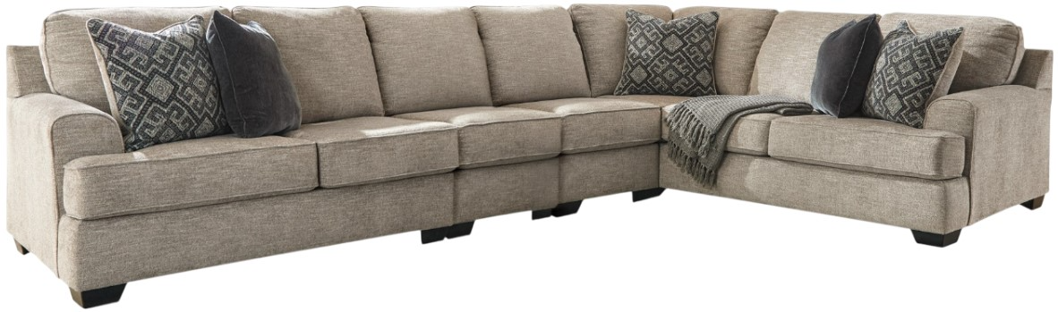 Whether your vision is clean and contemporary or cozy modern farmhouse, this sectional in a stone-tone neutral upholstery has the corner on style. Merging ultimate comfort with striking good looks, this chic sectional includes coordinating accent pillows for that much more feel-good allure.Read More