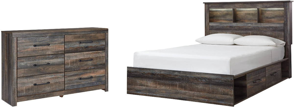 Includes bed (bookcase headboard, footboard, underbed storage unit, platform rails and wood roll slats) and 6-drawer dresser